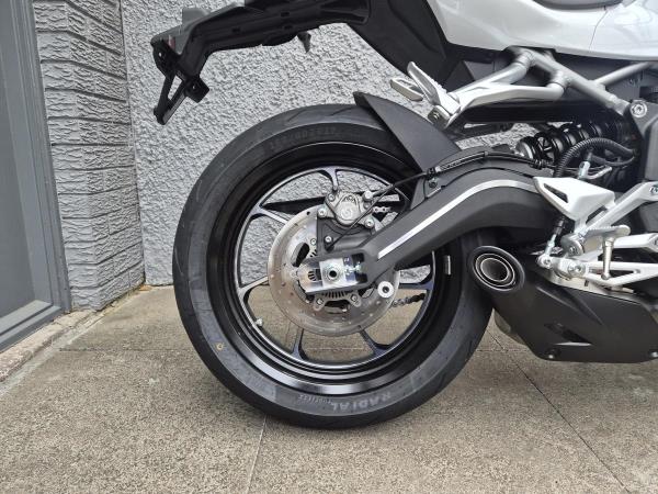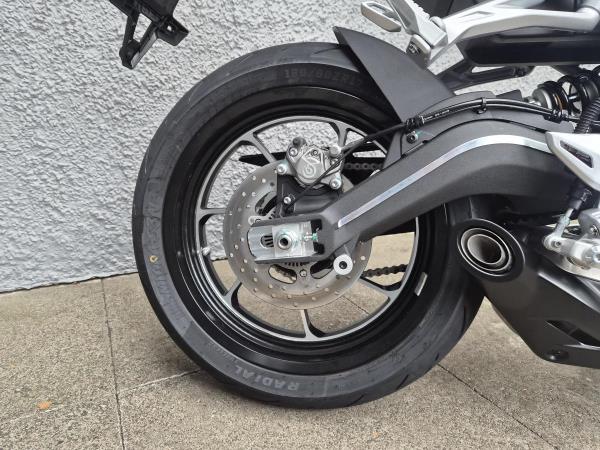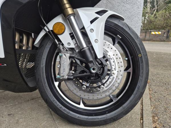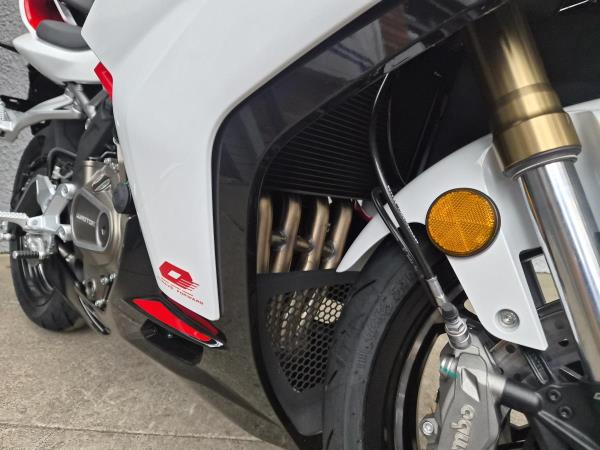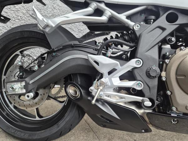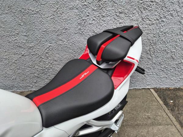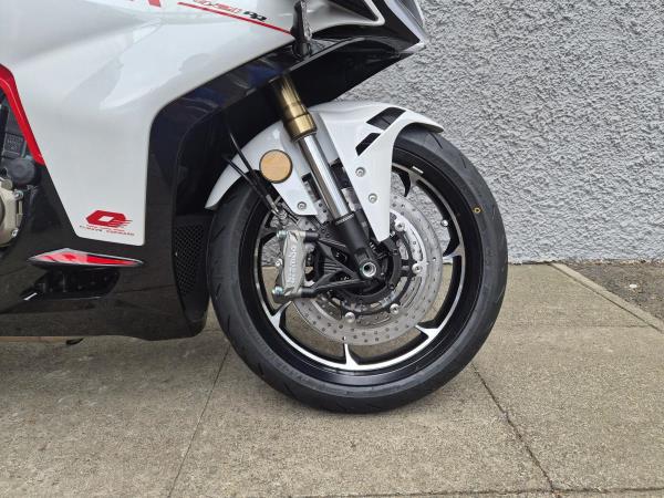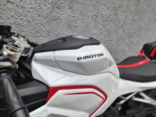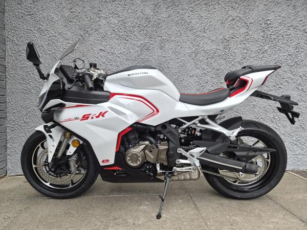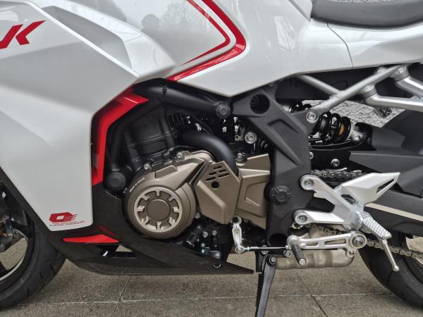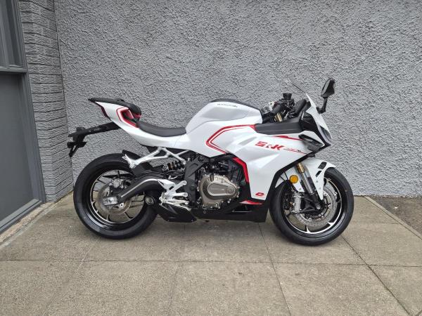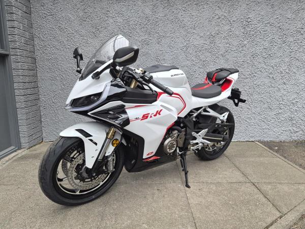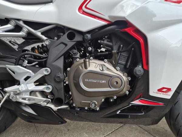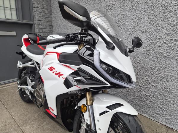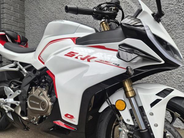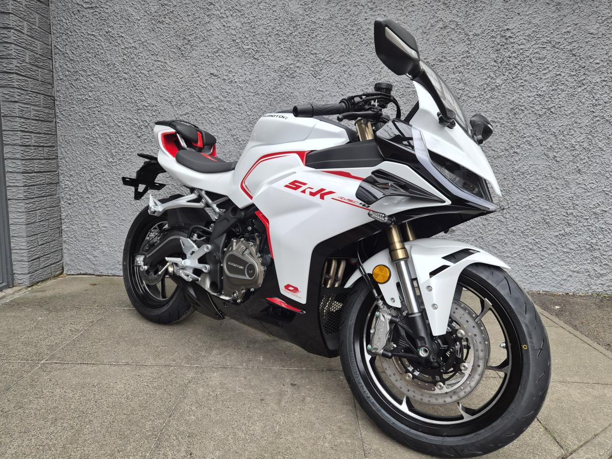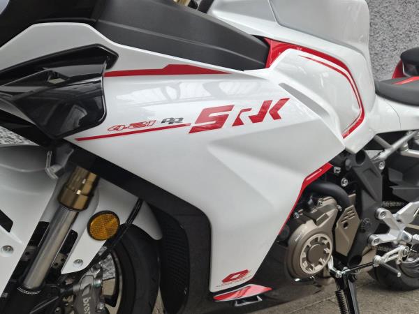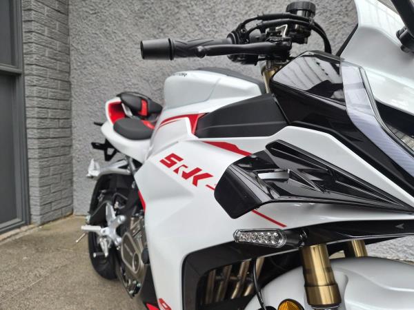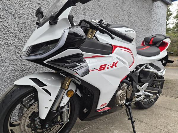 The QJMOTOR SRK 421 RR has officially arrived to shake up the mid-weight SuperSport category, blending aerodynamic engineering with high-speed styling. The SRK 421 RR fuses a screaming four-cylinder soundtrack with precision control to deliver an unprecedented thrill for those chasing the ultimate ride. The heart of the SRK 421 RR is a 421cc inline four-cylinder, 16v DOHC engine producing 77Bhp (57kW) at 14,000rpm. Designed for linear and smooth power delivery, the engine is beginner-friendly while offering high-rev thrills for track-inspired performance. A peak torque of 39Nm is delivered at 13,000rpm, but still produces enough low-end urgency to ensure responsive delivery on city streets. The engine also features DLC-treated valve tappets, an electroplated ceramic cylinder and a forged alloy steel camshaft. High-end components are also used from famed Japanese companies, including FCC paper-based clutch plates, NTN bearings, RIK piston rings, and Daido crankshaft bearings. The SRK 421 RR has been crafted by the designers of some of the most acclaimed motorcycles and features original mecha-inspired styling that creates a futuristic presence. Its aerodynamic bodywork includes bold lines, geometric cuts, and a hollowed tail section that channels airflow to reduce drag. The aggressive front face is equipped with a Ram Air intake to ensure efficient combustion and enhanced power output at speed. Secure this bike with just £200 deposit. On the road cost of £300 will be charged and includes PDI, 1st reg fee and 12 months road tax. Low rate finance & mainland UK delivery available.