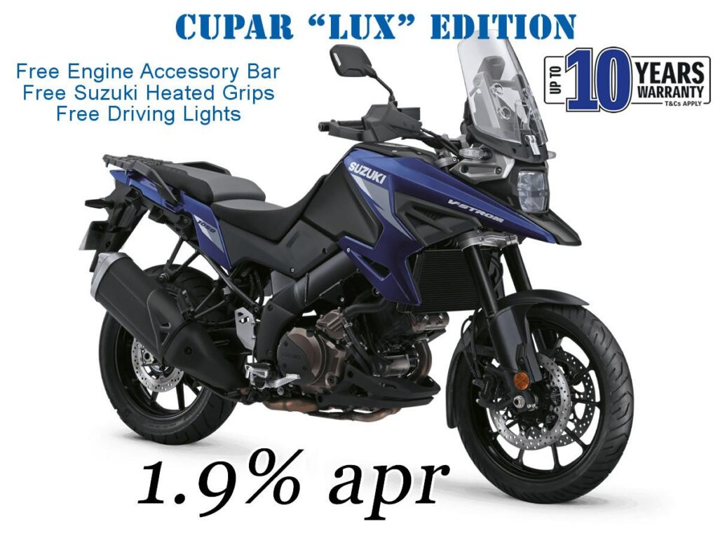 FOR WHEREVER YOUR JOURNEY TAKES YOU. *3 box aluminium luggage available @ £1500 in a choice of silver or black (subject to stock) Cupar special “Lux” edition, this amazing deal saves over £3000 with some accessories included!These bikes come with Genuine Suzuki heated grips, Accessory bars, and Interphone driving lights. List price of a standard DL1050 RR – £13,499Extra accessories fitted – £1406Total – £14,905 Our price at £11,495, saves £3410, you dont want to miss this deal. Conquer new terrain, explore new horizons, and experience new adventures. A 19-inch cast front wheel with road focused tyres, generous rider and pillion seats, large adjustable screen and dedicated handlebars and footpegs provide comfort and long-haul on-road ability. Bespoke ergonomics, electronic rider aids, cruise control, quickshifter and full-colour TFT display offer even greater confidence and excitement on every journey. ANY TERRAIN. ANY HORIZON, ANY ADVENTURE. Just £11,495, saving £3410, blue and black bikes only strictly while current stocks last. On the road price, including registration, 12 months tax, 36 months factory warranty (extendable up to 7 years), 12 months AA cover, Alphadot security marking, a full tank of fuel, and our 500 miles/ 30 day money back guarantee. Available now with 1.9% APR PCP & HP, for up to 3 years with £500 Deposit Reserve one online on our website showroom page at cupar.co.uk Contact us for a finance quote to suit your budget.