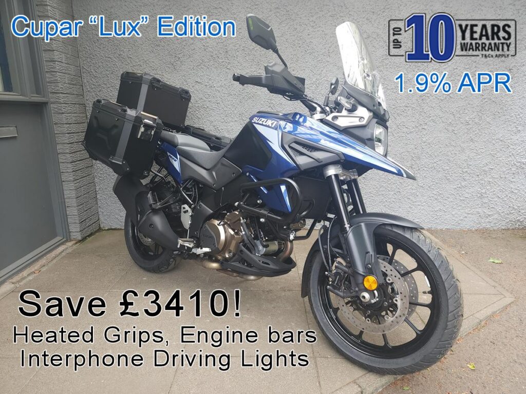 FOR WHEREVER YOUR JOURNEY TAKES YOU. The Tour model includes 3 box aluminium luggage in a choice of silver or black (subject to stock) Cupar special “Lux” edition, this amazing deal saves over £3000 with some accessories included!These bikes come with Genuine Suzuki heated grips, Accessory bars, and Interphone driving lights. List price of a standard DL1050 RR Tour – £14,999Extra accessories fitted – £1406.29Total – £16,405.29 Our price at £12,995 saves £3410, you dont want to miss this deal. Conquer new terrain, explore new horizons, and experience new adventures. A 19-inch cast front wheel with road focused tyres, generous rider and pillion seats, large adjustable screen and dedicated handlebars and footpegs provide comfort and long-haul on-road ability. Bespoke ergonomics, electronic rider aids, cruise control, quickshifter and full-colour TFT display offer even greater confidence and excitement on every journey. ANY TERRAIN. ANY HORIZON, ANY ADVENTURE. Just £12995, saving £3410, blue and black bikes only strictly while current stocks last. On the road price, including registration, 12 months tax, 36 months factory warranty (extendable up to 7 years), 12 months AA cover, Alphadot security marking, a full tank of fuel, and our 500 miles/ 30 day money back guarantee. Available now with 1.9% APR PCP & HP, for up to 3 years with £500 Deposit Reserve one online on our website showroom page at cupar.co.uk Contact us for a finance quote to suit your budget.