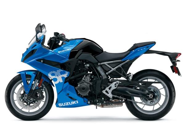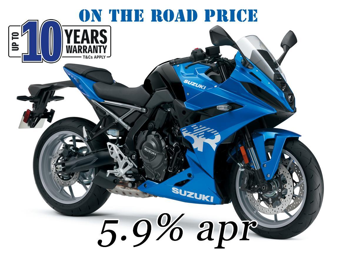 Deal on Blue bikes only RRP – £8999, save £1004, our price £7995 Immediately highlighting the R element of the new GSX-8R is its full fairing, wind tunnel-tested to increase aerodynamic performance and provide weather protection for the rider. Bold 8R logos adorn the side panels, while fairing-mounted mirrors also aid in reducing drag. Perched in the middle of the angular face is the recognisably GSX series stacked LED headlight, topped by an LED position light. The rear combination light is also full LED, as are the indicators. At the heart of the new GSX-8R is the 776cc parallel twin engine – which it shares with the GSX-8S – with its long stroke and 270° crankshaft design providing an abundance of low-down torque, usability, and flexibility, while a free-revving nature comes from a DOHC and four valves per cylinder. Peak torque is 78 Nm, delivered at 6800rpm, with peak power of 82.9PS coming at 8500rpm.The 270° crankshaft also provides a power delivery, character, and rumble reminiscent of Suzuki’s much-lauded V-twin ranges, while a patented cross balancer design ensures a smoothness, as well as aiding in a compact, lightweight engine design.A two-into-one exhaust system with dual-stage catalytic converter keeps the 8R conforming toEuro 5 emissions standards, and ends in a short, underslung silencer further enhancing the compact, slimline look.All of that is housed in a steel frame engineered for direct handling characteristics. Those handling characteristics are further enhanced by low, forged aluminium handlebars that providepositive control and a sporty riding position, placing more of the rider’s weight over the frontwheel. Bolted into the rear of the steel frame is a lightweight aluminium subframe and lightweight aluminium swingarm,Dealing with the increased weight bias towards the front, Showa provides the suspension, withSFF-BP* (Separate Function Fork – Big Piston) inverted forks and monoshock in the rear.Mounted radially to the forks are Nissin four-piston calipers, providing stopping power by biting310mm discs. Tyres are Dunlop Roadsport 2s.Aiding rideability, usability, and flexibility is a suite of electronic systems that includes a bi-directional quickshifter as standard, three selectable engine power modes, and three selectabletraction control settings, plus the ability to disengage the system entirely. There’s also Suzuki’s low RPM assist and easy-start function.The GSX-8R’s settings are easy to navigate via a single rocker switch on the left-handhandlebar, with the information displayed clearly on a colour 5” TFT screen. Reserve one online on our website showroom page at cupar.co.uk Just £7995, save £1004. OTR pricing including registration, 12 months tax, 12 months AA cover, 36 months factory warranty, a full tank of fuel, Alphadot security marking, and our 30 day 500 mile money back guarantee (subject to 10% of the purchase price with new bikes). Available now with 5.9% APR PCP & HP, for up to 3 years with £1000 Deposit