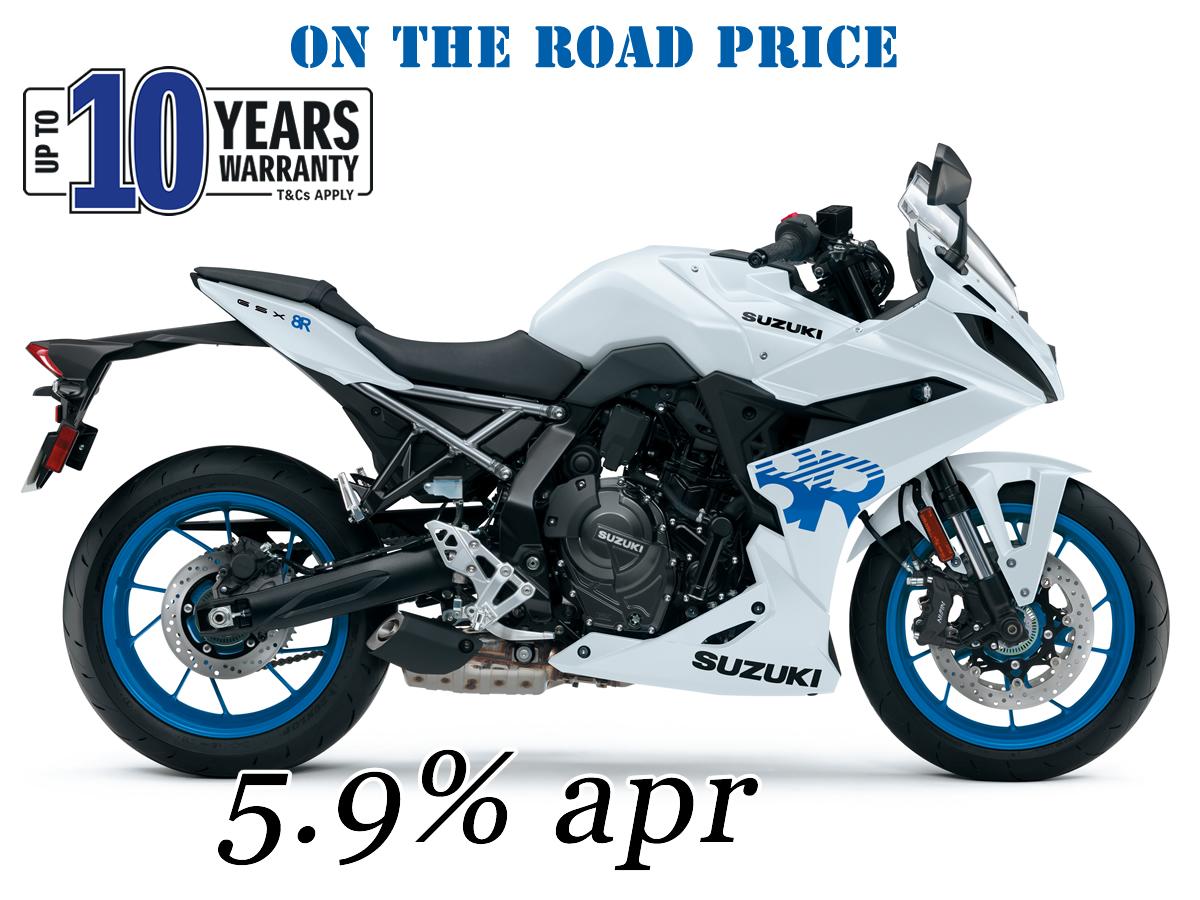 RRP – £8999, save £504, our price £8495 Immediately highlighting the R element of the new GSX-8R is its full fairing, wind tunnel-tested to increase aerodynamic performance and provide weather protection for the rider. Bold 8R logos adorn the side panels, while fairing-mounted mirrors also aid in reducing drag. Perched in the middle of the angular face is the recognisably GSX series stacked LED headlight, topped by an LED position light. The rear combination light is also full LED, as are the indicators. At the heart of the new GSX-8R is the 776cc parallel twin engine – which it shares with the GSX-8S – with its long stroke and 270° crankshaft design providing an abundance of low-down torque, usability, and flexibility, while a free-revving nature comes from a DOHC and four valves per cylinder. Peak torque is 78 Nm, delivered at 6800rpm, with peak power of 82.9PS coming at 8500rpm. The 270° crankshaft also provides a power delivery, character, and rumble reminiscent of Suzuki’s much-lauded V-twin ranges, while a patented cross balancer design ensures a smoothness, as well as aiding in a compact, lightweight engine design. A two-into-one exhaust system with dual-stage catalytic converter keeps the 8R conforming toEuro 5 emissions standards, and ends in a short, underslung silencer further enhancing the compact, slimline look.All of that is housed in a steel frame engineered for direct handling characteristics. Those handling characteristics are further enhanced by low, forged aluminium handlebars that providepositive control and a sporty riding position, placing more of the rider’s weight over the frontwheel. Bolted into the rear of the steel frame is a lightweight aluminium subframe and lightweight aluminium swingarm,Dealing with the increased weight bias towards the front, Showa provides the suspension, withSFF-BP* (Separate Function Fork – Big Piston) inverted forks and monoshock in the rear.Mounted radially to the forks are Nissin four-piston calipers, providing stopping power by biting310mm discs. Tyres are Dunlop Roadsport 2s. Aiding rideability, usability, and flexibility is a suite of electronic systems that includes a bi-directional quickshifter as standard, three selectable engine power modes, and three selectabletraction control settings, plus the ability to disengage the system entirely. There’s also Suzuki’s low RPM assist and easy-start function.The GSX-8R’s settings are easy to navigate via a single rocker switch on the left-handhandlebar, with the information displayed clearly on a colour 5” TFT screen. Reserve one online on our website showroom page at cupar.co.uk Just £8495, save £504. OTR pricing including registration, 12 months tax, 12 months AA cover, 36 months factory warranty, a full tank of fuel, Alphadot security marking, and our 30 day 500 mile money back guarantee (subject to 10% of the purchase price with new bikes). Available now with 5.9% APR PCP & HP, for up to 3 years with £1000 Deposit