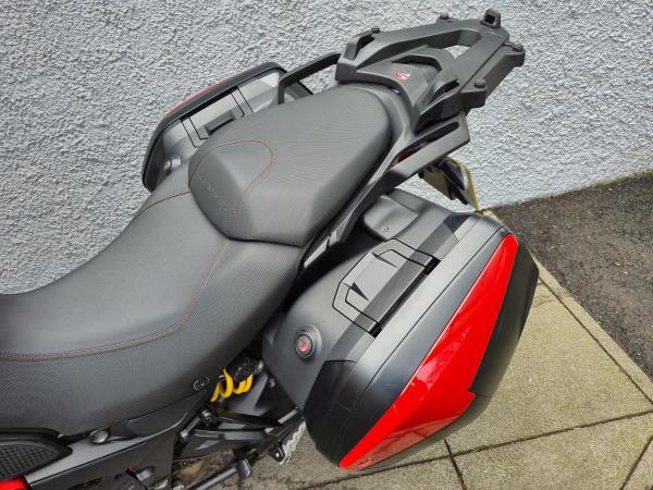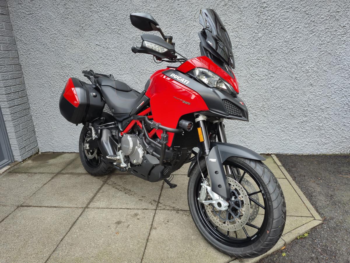 The Multistrada 950 combines Multistrada 1200 and Multistrada 1200 Enduro design features to perfection, taking the “lightest” elements from both. The front-on view, with the distinctive headlight, ‘beak’, adjustable screen, two ‘wings’ and tank come from the Multistrada 1200. The rider’s seat with narrow mid-section, the passenger seat, rear grab rail, the design of the exhaust and swingarm and the wheel sizes were, instead, taken from the Multistrada 1200 Enduro. This mix has produced a bike with classic Multistrada lines that’s also compact, and not just visually. Other Multistrada 950 hallmarks include the assertive, high-tech front headlight and LED tail light. Features such as the frame (designed to maximise efficiency in terms of both weight and performance), the rear sub-frame (aluminium with integrated pannier supports) and new switchgears (ergonomic and practical) are just some of the characteristics that underscore Ducati’s attention to detail. Full Desmo service recently completed. Low rate finance & UK mainland delivery available Call the sales team on 01334 655707