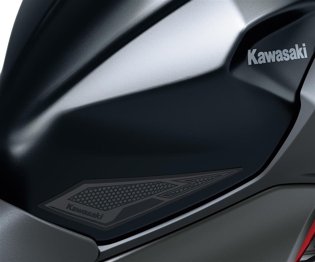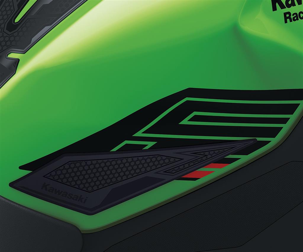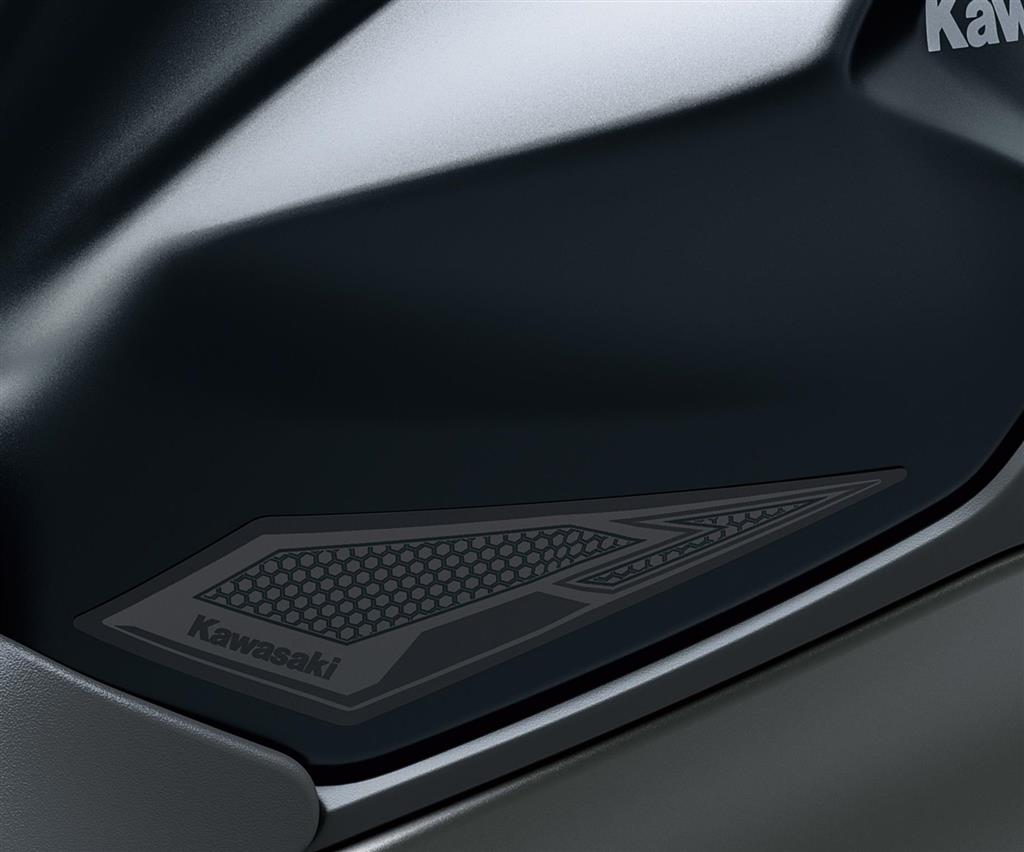 Decorative black foil knee pad set with Kawasaki logo and honeycomb pattern.