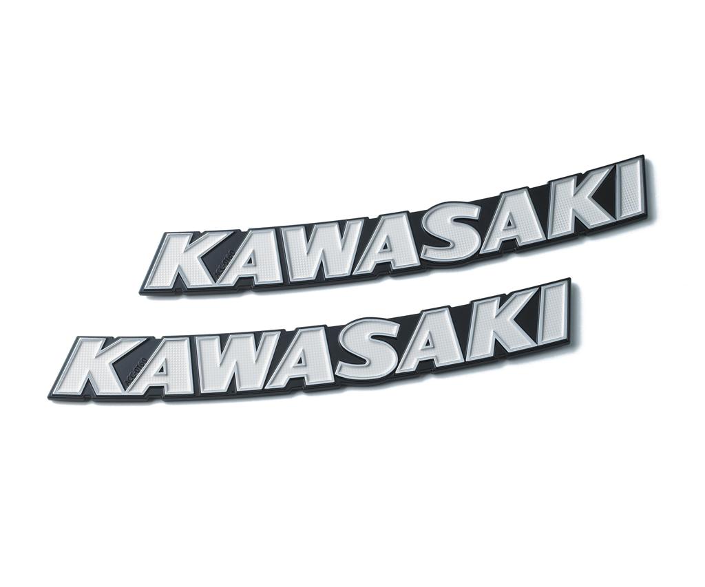 These two white "kawasaki" emblems as a replacement for the standard kawasaki emblems.